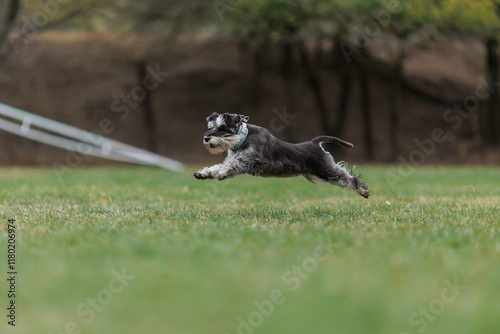 Obraz premium A Miniature Schnauzer dog is running in the park