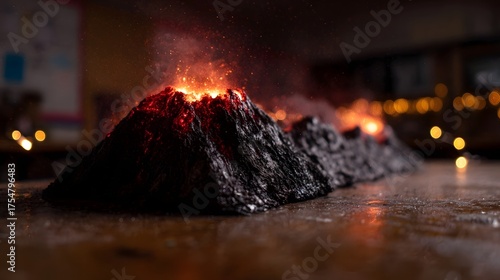 © Thares2020, Naklejka premium A miniature volcano model erupts with glowing red lava and smoke against a softly blurred background of warm lights