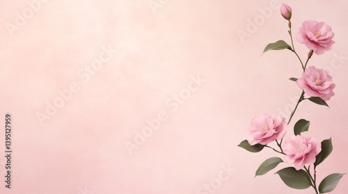 © puritut, Obraz premium A minimal composition of blush pink camellias on a pastel rose background, arranged in the corners with central negative space.