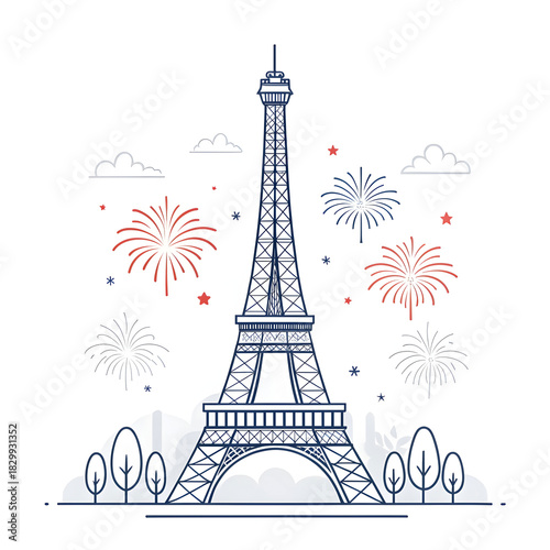 © Allah Rakha, Fototapeta premium A minimal Eiffel Tower design accented with small abstract fireworks creating a festive modern visual highlighting