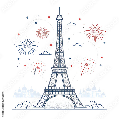 © Allah Rakha, Fototapeta premium A minimal Eiffel Tower design accented with small abstract fireworks creating a festive modern visual highlighting