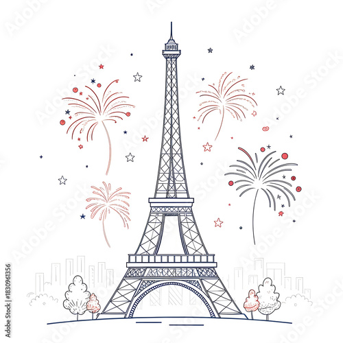 Fototapeta premium A minimal Eiffel Tower design accented with small abstract fireworks creating...