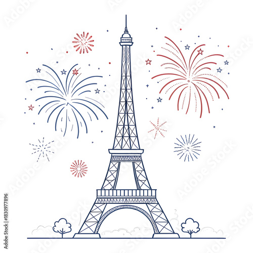 Fototapeta premium A minimal Eiffel Tower design accented with small abstract fireworks creating...