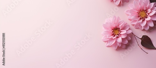 Fototapeta premium A minimal floral arrangement composed of a single pink flower resting on a soft pastel pink backdrop creates a delightful spring themed image The arrangement is neatly positioned for a flat lay photo