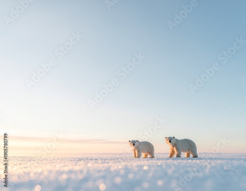 Naklejka premium 美しい柔らかな夕焼けの光に包まれた白熊の人形のミニマル背景 a minimal scene with a polar bear figurine bathed in soft, beautiful sunset light