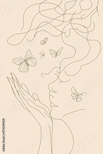 Fototapeta premium A minimal single line art of a woman releasing butterflies from her hands, symbolizing the transformation of negative thoughts into positive energy, hand-drawn style minimalist