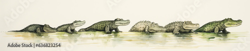Obraz premium A Minimal Watercolor Banner of a Row of Alligators on a White Background