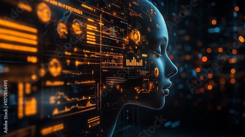 © Emiliia, Obraz premium A minimalist AI head showcases dynamic floating graphs in a futuristic digital environment