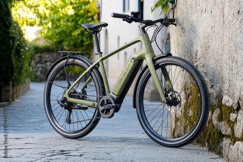 © Sanchai, Fototapeta premium A minimalist ash green bicycle, parked next to an old stone wall in a European alley