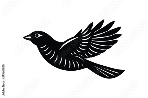 © Jannatul, Obraz premium a minimalist beautiful linocut flying Grosbeak bird silhouette black vector artwork illustration