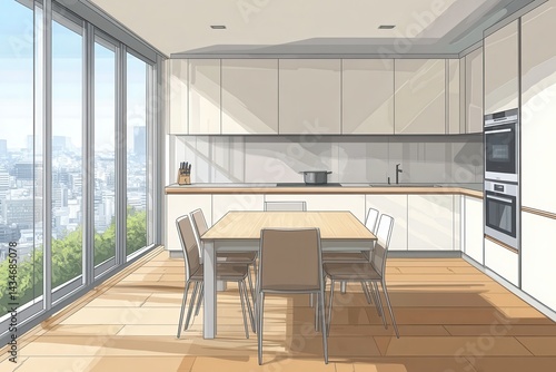 Fototapeta premium A minimalist beige and white kitchen interior with a dining table, chairs,...