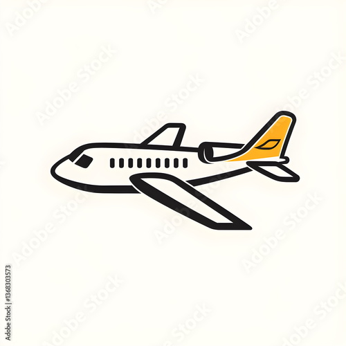 © Thisisanuar, Fototapeta premium A minimalist black and white logo of an airplane with streamlined wings, a bright yellow emblem on the tail, and clean, curved lines. The design is simple, elegant, and features subtle pastel shading