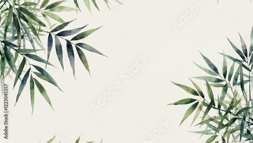 © Tipphawan, Naklejka premium A minimalist botanical illustration featuring delicate watercolor leaves on a soft beige background. Green leaves background