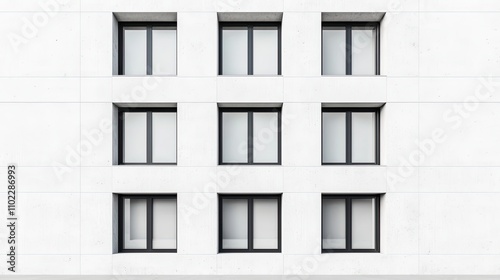 © OngCaLucK, Fototapeta premium A minimalist building facade featuring a grid of six rectangular windows against a plain white wall.