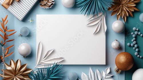 © Rose on Lens, Obraz premium A minimalist Christmas flat lay featuring ornaments, gift boxes, and a blank card for seasonal blank greetings, perfect for holiday designs and email marketing
