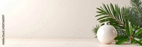 Fototapeta premium A minimalist Christmas setting featuring a white ornament with green foliage on a light, neutral background.
