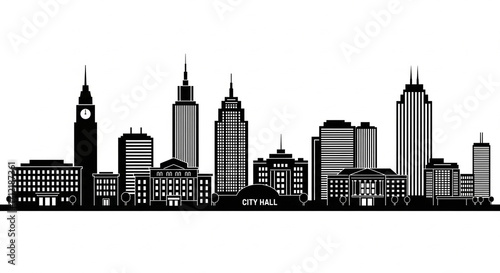 © hanna, Naklejka premium A minimalist city silhouette vector illustration featuring tall buildings, a city hall, and office towers. Ideal for infographics, presentations, and design templates.