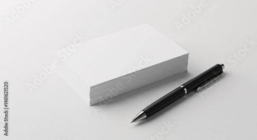 © Rafael, Fototapeta premium A minimalist composition featuring a stack of white cards and a sleek black pen on a white surface