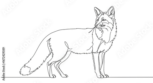 © Shehzad, Fototapeta premium A minimalist continuous single line drawing of a standing fox looking back over its shoulder on a white background.