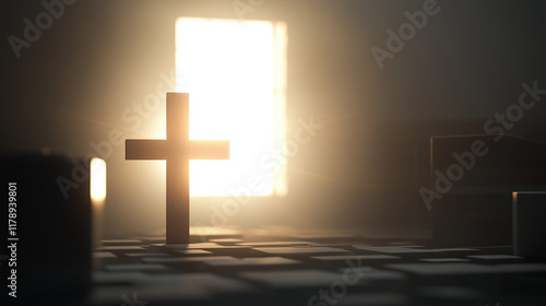 Naklejka premium A minimalist depiction of the resurrection, with a simple wooden cross and a bright light shining behind it, symbolizing hope and new beginnings.