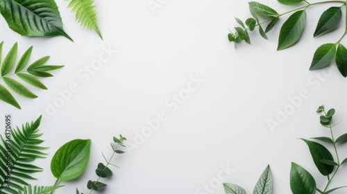 Obraz premium A minimalist design featuring a green foliage border framing a clean white background, providing ample copy space for text or graphics. The natural elements create a fresh and serene atmosphere.