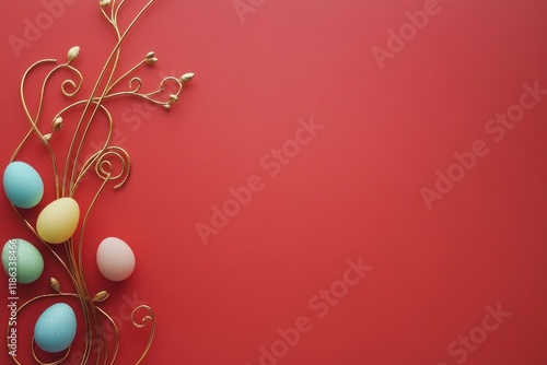 © Ladawan, Fototapeta premium A Minimalist Design Featuring Colorful Easter Eggs on a Vibrant Red Background Perfect for Celebrating the Chinese New Year and Easter Festivities