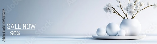 © JAKE STUDIO, Obraz premium A minimalist design featuring white vases and eggs on a plate, highlighting a 90% off sale.