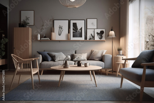 Fototapeta premium A minimalist design with a comfortable light tone living room interior