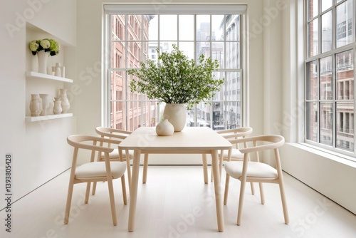 Fototapeta premium A minimalist dining area with four chairs, a simple table, and a plant centerpiece