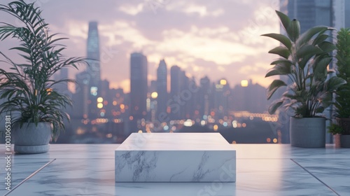 © BerkahStock, Obraz premium A minimalist display platform with a city skyline at sunset in the background.