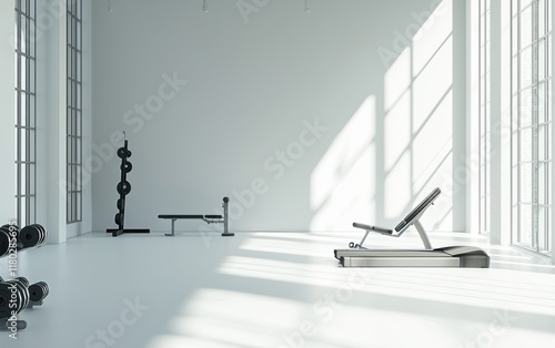 © Sergey Fedchenko, Naklejka premium A minimalist gym-themed background with a clean white floor, workout equipment, and diffused natural lighting