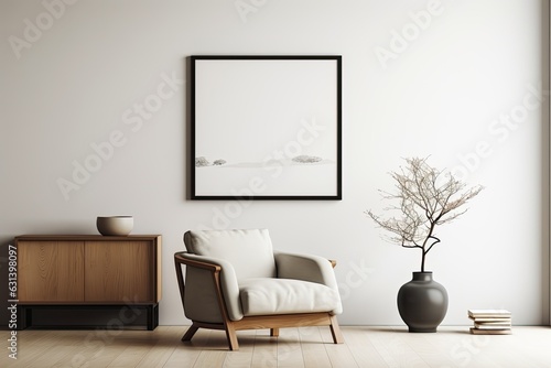 Obraz premium A minimalist home decor template showcasing an elegantly styled living room with a mock up poster frame, a wooden commode, a book, a leaf in a ceramic vase, and sophisticated personal accessories. The
