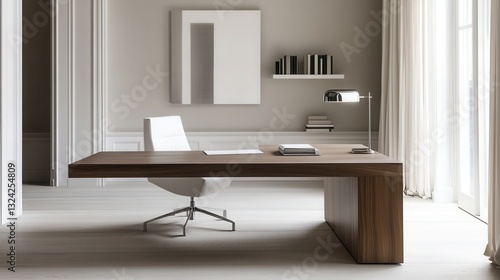 © Игорь Бондаренко, Fototapeta premium a minimalist home office with a sleek wooden desk, a simple white chair, and a large uncluttered workspace.