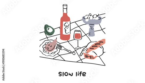 © Humaira, Obraz premium A minimalist illustration of a wine and cheese setting for a slow life