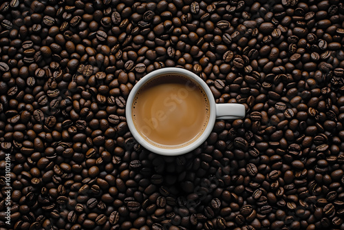 Fototapeta premium A minimalist image of a mug of coffee surrounded by coffee beans, capturing...