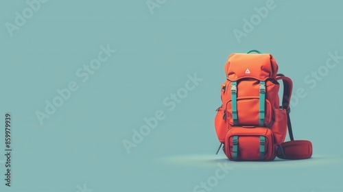 © Anat art, Obraz premium A minimalist image showcasing a bright orange backpack on a simple, light blue backdrop. This simple yet impactful image symbolizes adventure, travel, and exploration. Generative AI