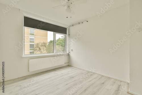 Fototapeta premium A minimalist interior featuring white walls and flooring, with a large window...