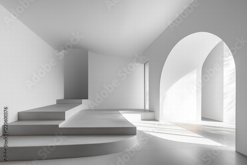 Fototapeta premium A minimalist interior space featuring smooth, white surfaces, geometric shapes, and soft natural light. The design includes steps leading to different levels and archways.