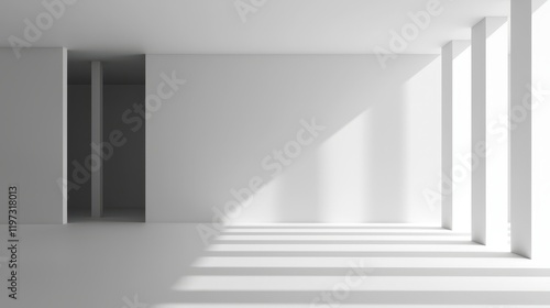 Fototapeta premium A minimalist interior space with white walls and floor, featuring natural light casting shadows through tall columns.