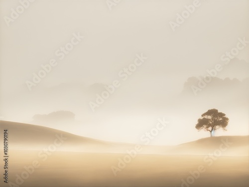 © Alena Girya, Obraz premium A minimalist landscape with a single tree in a vast, empty space, evoking solitude and simplicity. Perfect for modern, calming interiors.
