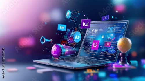 © Petchladda, Fototapeta premium A minimalist layout with soft-toned marketing tools around a laptop screen, highlighting online advertising strategies in a new style