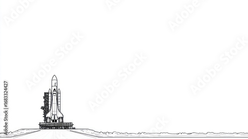 Obraz premium A minimalist line drawing depicts a space shuttle on a launchpad against a stark white background, leaving ample empty space to the right