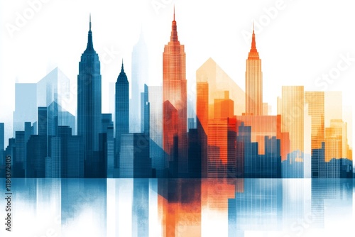 Naklejka premium A minimalist line drawing of an urban skyline at sunset, with clean geometric shapes representing skyscrapers in orange and blue tones on a white background