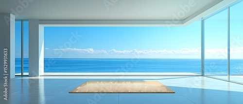 © highspirit, Fototapeta premium A minimalist living room featuring a single beige rug in the center of the room. The surrounding area is completely empty, emphasizing clean, open floor space and natural light