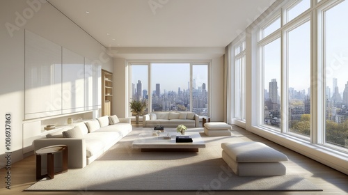Fototapeta premium A minimalist living room with a light neutral palette, large windows, and...