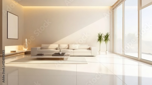 © Attasit, Fototapeta premium A minimalist living room with a sleek sofa, a coffee table, and a large window.
