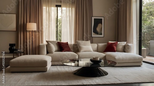 © Al, Obraz premium A Minimalist Living Room with Neutral Tones and Modern Charm