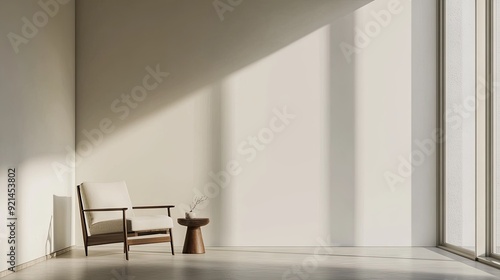 Fototapeta premium A minimalist living space with a large window, a single chair, and a small side table.