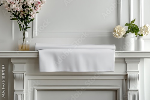 Fototapeta premium A minimalist mantel display featuring flowers and a white cloth.