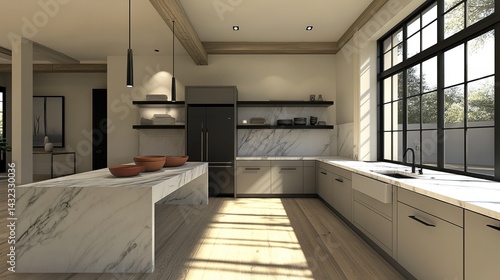 © ZHI, Fototapeta premium A minimalist modern kitchen with sleek matte black fixtures, luxurious marble countertops and open shelving that showcases elegant ceramic bowls.